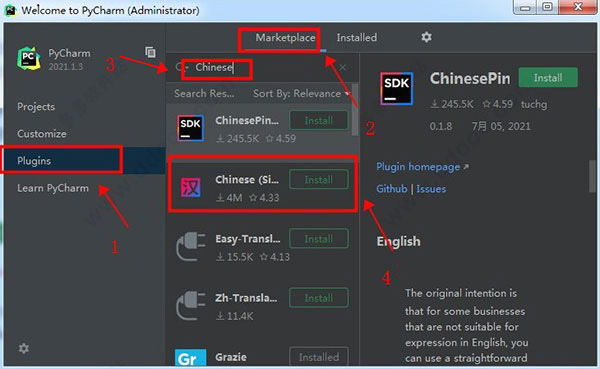 6、点击Plugins,选择Marketplace,在文本框内输入Chinese回车搜索,之后在下面会出现一个Chinese的插件,点击install安装插件;