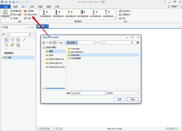 5、要是完全的新建一个地图,其操作跟ArcMap类似,可以在工程中创建文件夹连接,并将数据加载到其中。或者直接在工程默认的gdb中导入自己的数据。下图是使用了【添加文件】的方式进行数据连接。