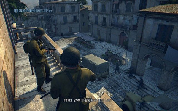 来到阳台,先和下面的敌军车队交战,之后一个敌人突袭,杀死了一个队友,击杀房间内的敌人之后,大批敌人赶到。