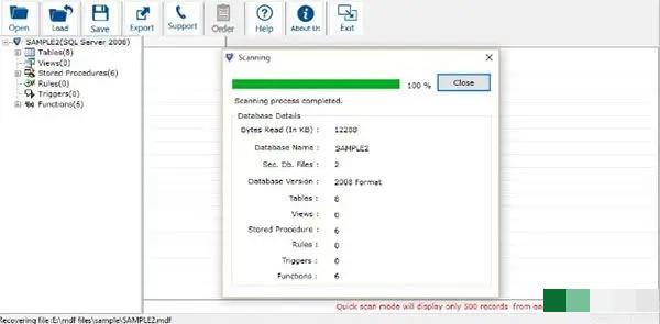 4、在MDF文件上执行快速扫描操作后,SQL恢复软件将显示扫描报告