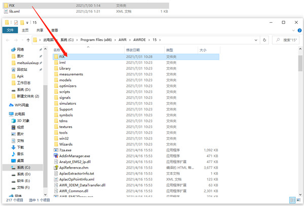 7、先不要运行软件,打开AWR15_FIX文件夹,将FIX文件夹的文件复制到C: program files (x86) AWR awde 15 中,