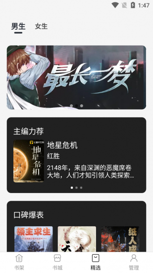 黑洞小说最新版2022是小编最近新发现的一款收小说阅读应用,它最大的亮点就是免费,可以让你永久免费阅读各种小说,可以说在里面没有你找不到的小说,因为软件内置了几百个书源,各种小说全都包含在内,只有你想不到没有找不到的小说。这款应用非常受小说迷的喜爱,里面有数不清的小说资源,各种题材都有,男女专属频道,玄幻、奇幻、武侠、仙侠、都市、职场、历史、军事、游戏、体育、科幻、灵异、同人等等超级多的小说题材,总会有你喜欢的,书城有你看不完的小说。这里还有专门的精选栏目,主要用来为你精选一些优质好看的小说资源,全都是精品资源,随时想看就看,完全不用受到限制哦!这里的所有小说都是永久免费的,不需要你一分钱,再也不用担心小说看一半要收费啦,还支持下载缓存哦,再也不用担心书荒了,快来下载试试吧!