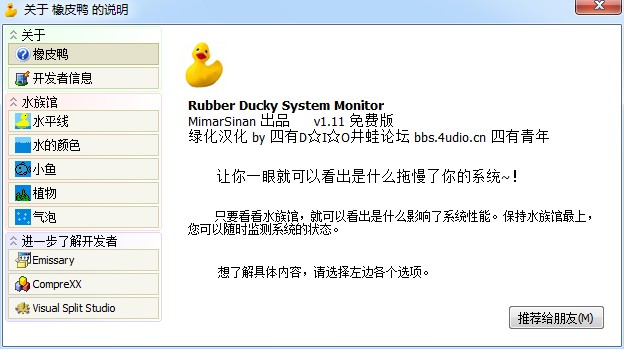 Rubber Ducky是一款来自国外的橡皮鸭电脑检测软件,能够随时对你的电脑进行检测,你可以查看电脑的所有信息,还能实时了解系统的状态,非常强大实用,而且是比较有趣的哦,使用过的用户就会知道。该软件体积小巧,有着很清爽直观的用户界面,通过它你可以一眼就看出是什么拖慢了你的系统,随时可以看出是什么影响了系统性能,随时查看检测系统的状态,在界面左边有许多个选项,你可以了解到具体内容。软件的使用方法很简单,小编为你们提供的是“Rubber Ducky绿色汉化版”,该版本无需安装,双击就能运行,支持中文语言,你可以查看电脑的所有信息内容,它是以小型水族馆的方式进行的,水族馆的元素代表系统的各种信息,比如说水位代表着RAM使用,水色代表着交换文件使用,气泡则代表着CPU使用率,用户可以随时查看,试试监控磁盘变化。不仅如此,软件还能将所有记录下的数据生成报告哦,是非常实用的工具,有需要的朋友快来本站下载吧!