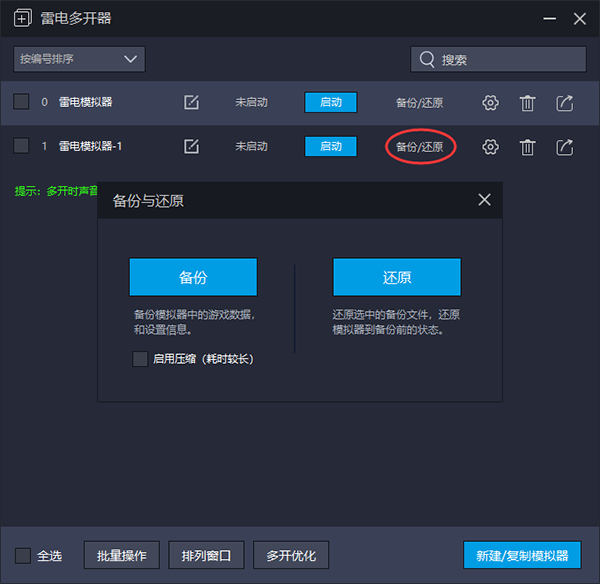 可以对点击的模拟器进行备份,或者是还原操作。处于启动的状态的模拟器是无法在雷电多开器界面创建快捷方式,设置,删除,备份还原等操作的。