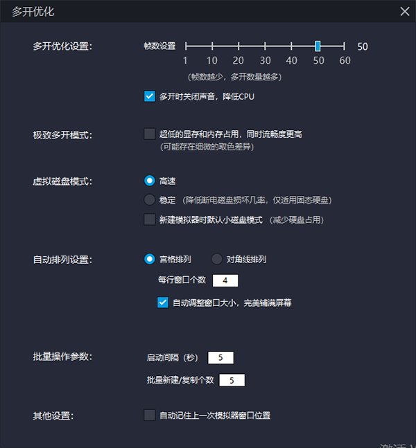多开优化:帧数设置、超低显存内存占用、虚拟磁盘、自动排列、批量操作参数