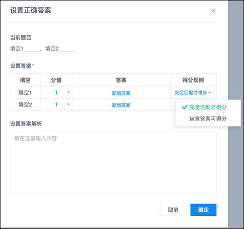 除了选择判断等题型外,对于必不可少的填空题,金山表单专门提供了设置完全匹配得分或包含内容即可得分,批卷更灵活。