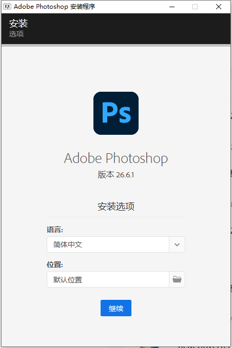 3、打开安装程序后,首先选择安装位置【如果更改了默认位置,则需要记住,后续步骤激活时需要用到】,然后点击继续;