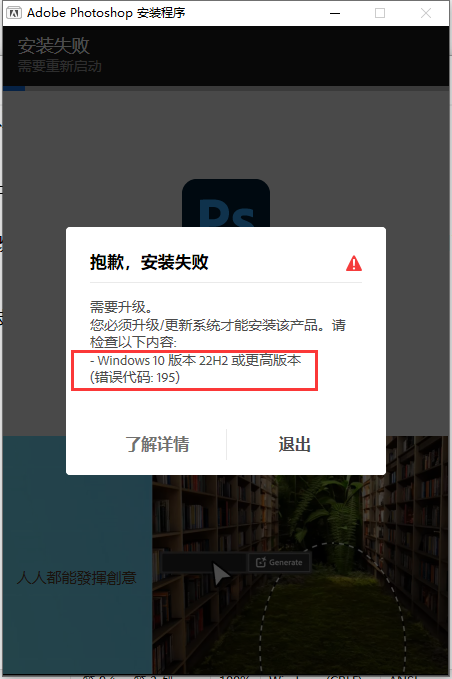 4、耐心等待安装,若出现下图情况,说明系统不支持,需要更新系统版本,PS2025支持的版本:Win 10 (V22H2)、Win 11 (V21H2、V22H2、V23H2、V24H2);