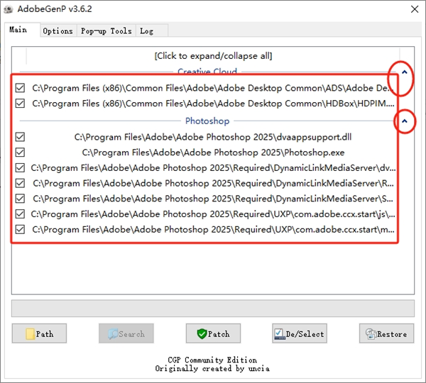 8、然后我们点击Search,会出现两个小标,点击右上角小标志展开,便可以看到需要激活的Photoshop 2025版本;