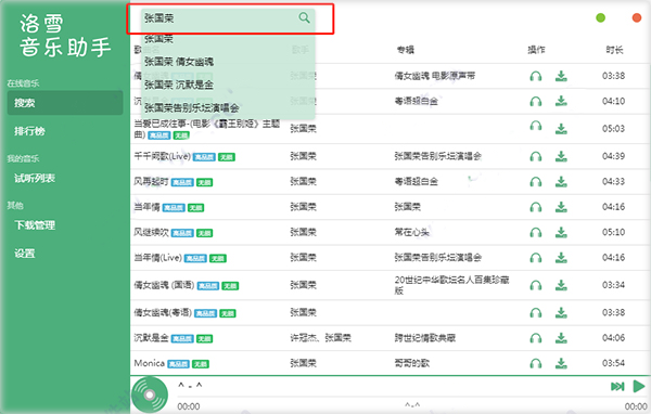 2、用户可以先在搜索栏中直接输入歌手名、歌曲名、专辑等信息进行搜索,例如小编输入了”张国荣”;