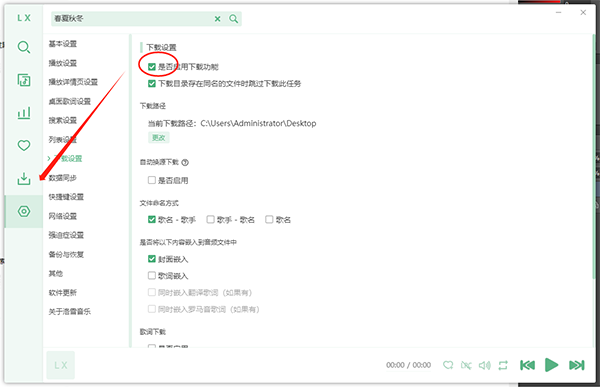 1、由于设置功能被隐藏了,这时就需要到设置中开启,同时还可以根据需求来设置歌词是否下载。