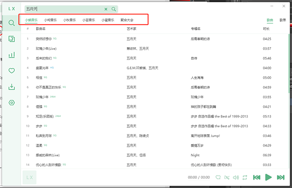 2、洛雪音乐助手内置了几个知名音乐来源,每个搜索都对应一个爬取的音乐平台,所以可以看到即使是同一个搜索词,不同的搜索平台,搜索到的内容还是有区别的。