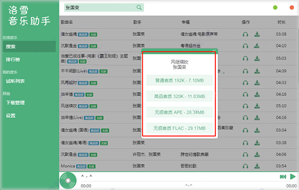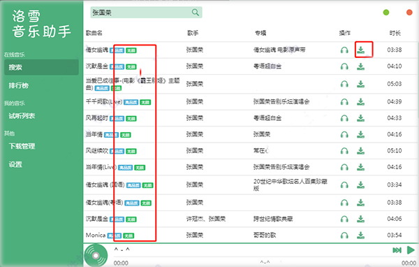 3、随后洛雪音乐助手就快速搜索出了一堆歌曲,并都提供了无损的版本,然后可点击右边的下载按键;