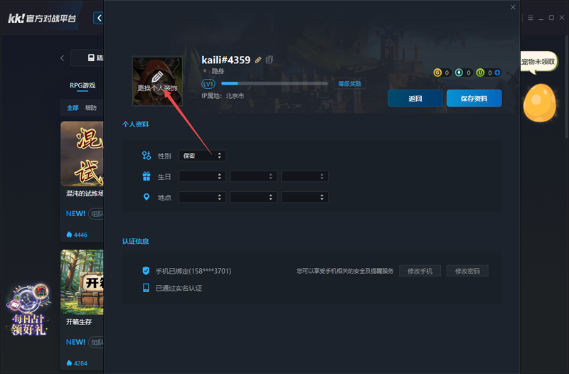 3、将鼠标的光标放到头像上,可以看到【更换个人装饰】的文字,直接点击它。