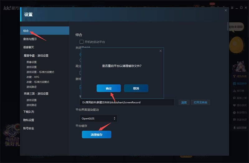 3、在【综合】设置界面右侧,找到【平台缓存】下方的【清理缓存】按钮,点击它,然后点击弹窗中的【确定】按钮即可。