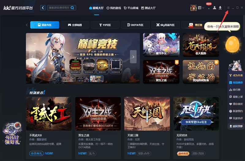 kk对战平台电脑版是一款专为广大游戏玩家提供开黑语音对战功能的游戏平台,原名叫UP平台,也是魔兽争霸对战平台之一,基本上大多数老魔兽争霸玩家都在使用这款游戏对战平台,在这里上线了大量丰富且优质的RPG地图,涵盖了塔防、防守、生存、对战、Roguelike、三消等多种游戏类型,满足了不同玩家的多元化需求,玩家可以体验到各种不同类型的游戏内容,包括经典的对战模式、刺激的天梯挑战、以及热闹的社区交流等。