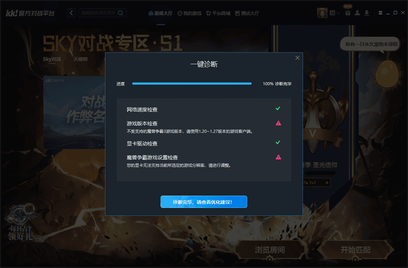 3、接着,软件就会开始进行诊断,如果网络速度检查和显卡驱动检查右侧是绿色的【√】说明就没有问题,有问题会显示红色的【!】。如果有问题,参考优化建议进行优化即可。