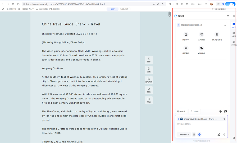 2.1全新升级与Qbot梦幻联动,支持更多高级功能阅读模式下打开Qbot,点击对应功能按钮即可对当前文章进行网页总结、生成脑图、相似网页推荐、网页翻译、对照翻译等功能,还能直接对当前文章内容发起AI对话。