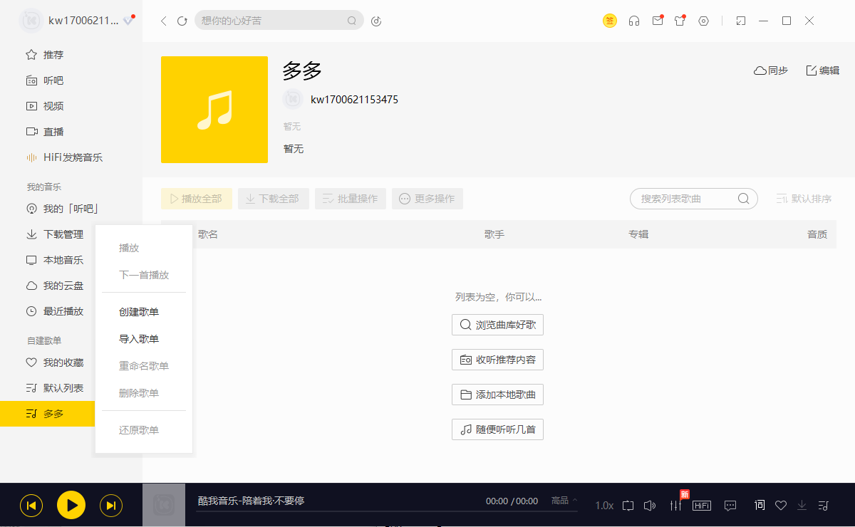 2、选择需要导入的歌单点击鼠标右键,找到并选择【导入歌单】选项,
