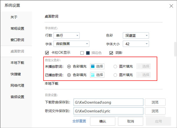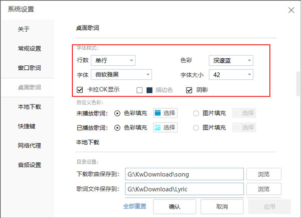 4、进去酷我桌面歌词设置界面之后,可以设置桌面歌词的字体样式和色彩,