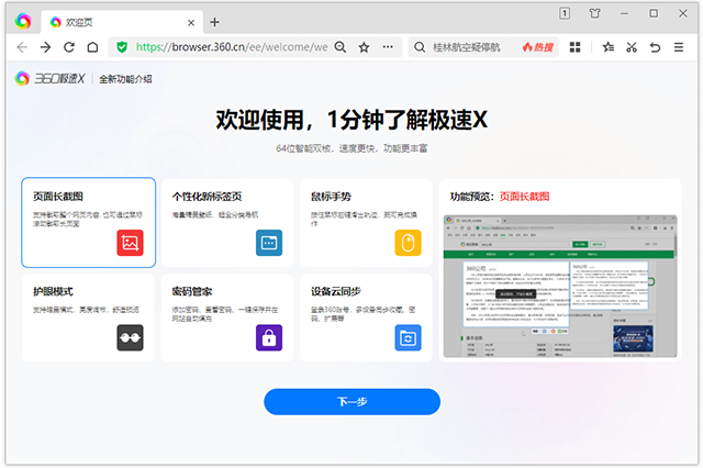 同时,360极速浏览器还为用户带来了全新的标签页、界面和海量的高清壁纸背景,并且网址导航也全新升级,高质量检索一步到位的同时还为用户收录了工作、娱乐、学习、旅游等超全分类的热门网站,可以让用户轻松快速找到你所需的网站。此外,360极速浏览器X还为用户带来了全屏浏览模式,通过全屏模式玩游戏、看电影、看照片等等,将会给用户带来极致的视觉体验,欢迎有兴趣的自选下载体验。