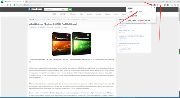 6、点击右上角的设置标签,点击网页翻译,它会出现翻译图标,点击图标,即可出现英文和中文,直接点击中文