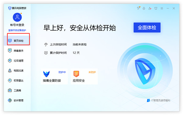1、打开在本站下载的腾讯电脑管家最新版,点击首页体验,点击全面体验即可对电脑进行全面体检;