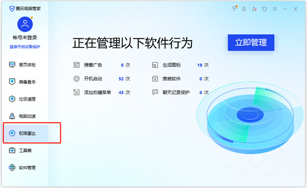 5、点击权限雷达,则可以扫描和管理电脑软件中的权限功能,对有弹窗或其它不好功能的软件进行处理;
