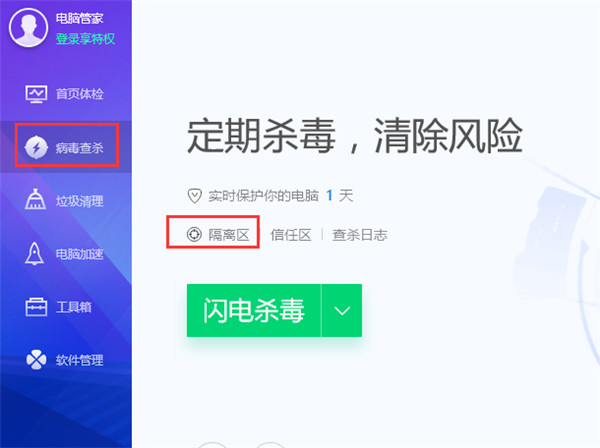 1、打开软件后点击左侧的【病毒检查】选择,然后在右侧界面中点击【隔离区】选项。
