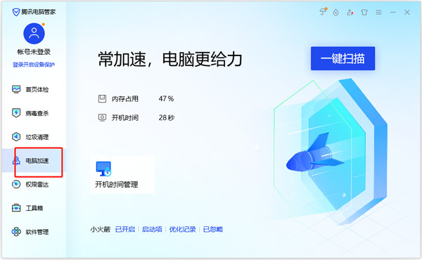 4、点击电脑加速,可以对启动项等影响电脑开机运行时间的选项进行优化,加速电脑运行;