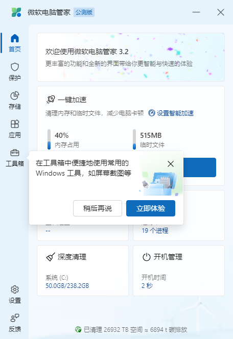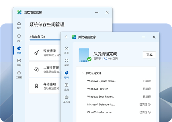 同时,微软电脑管家还提供了系统存储空间管理的功能模块,包括垃圾清理、大文件管理、存储感知、应用卸载等深度清理功能,给系统进行深度空间管理和强化的同时,还能释放更多系统存储空间,为Windows带来更深入的优化,给你带来丝滑顺畅的Windows使用体验。