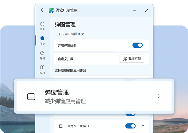 1、进入软件,点击下方的“保护”选项,点击弹窗管理;