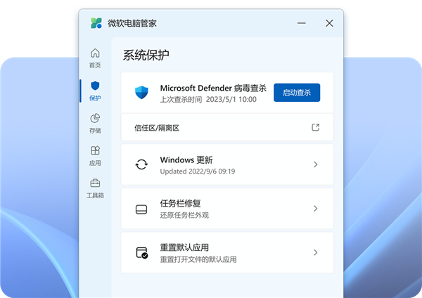 微软电脑管家主打低占用,不打扰,干净,不捆绑为主,为用户提供了非常去全面的电脑防护功能,如电脑体检、病毒查杀、优化加速等等功能,能够给用户带来更加安全、干净且流畅的电脑使用体验,能够让你的电脑运行更加稳定、快速,还能够轻松消灭病毒。