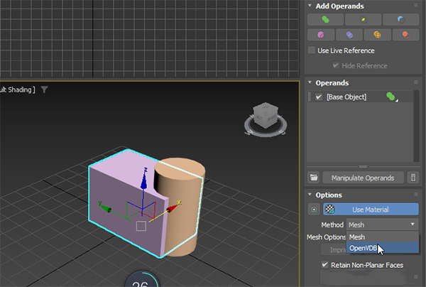 OpenVDB 方法是计算布尔运算的另一种方法。可以从无间隙几何体生成与拓扑无关的结果。可以在布尔修改器的“选项”卷展栏中选择“OpenVDB”。