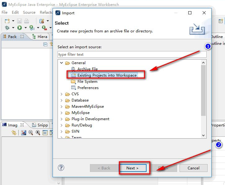 4、在”General”下方的选项中选择第二个”Existing Projects into Workspace”,然后点击”Next”,