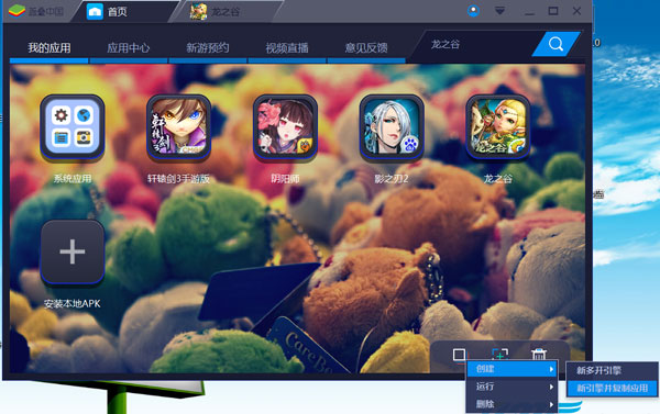 2、创建成功后,会出现新的模拟器操作界面,显示“桌面-多开1”,同时大家会注意到,首页中的多个游戏都复制完成,举例如下,大家要玩“龙之谷”请在“首页”中点击“龙之谷”图标,在“桌面-多开1”中点击“龙之谷”图标,此时会开启2个“龙之谷”游戏,以此类推,可以多开3个,4个,5个,甚至更多,不过依照各位的电脑配置决定,在这里建议大家多开3个。