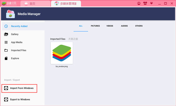2、打开模拟器首页-》系统应用-》多媒体管理器,点击” Import Form Windows” 从电脑选择需要导入的文件并导入。