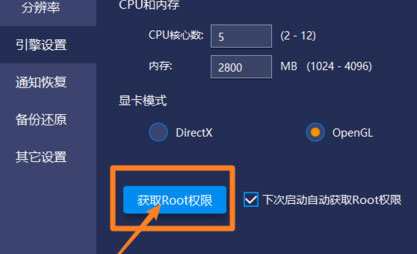 1、打开模拟器右上角倒三角-》设置-》引擎设置:点击 ”获取Root权限”, 然后点击确定关闭设置窗口