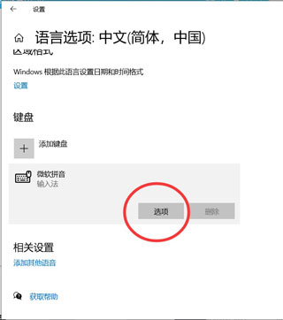 4、在出现的界面中选择键盘—–微软拼音;选中后点选项
