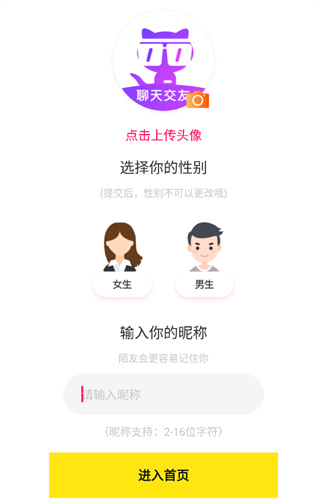 3、登录后,完善个人信息(头像、性别、昵称)