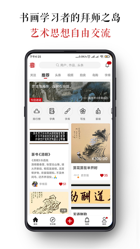 墨客岛app是一款专为书画艺术爱好者打造的学习软件,让来自全国各地的书画爱好者们都可以在这里学习拜师,也能在这查看到各种优秀的书画作品,或者拍卖购买各种名贵字画。这里内容优质,让书画爱好者的知识得到传播,还可以根据热门的话题,及时的查找到学习的课题,进入话题,与广大用户一起交流,汇集大家的知识和见识,就能够让您体验到丰富的文化知识。这里还是书画收藏者的寻宝之岛,可以欣赏岛驻岛艺术家的原创,浏览图画的销售价格,观看图片的信息。软件界面更加更加简洁、美观;充满了文艺气息,这里总有您喜欢的作品,值得您的珍藏和品位;总有您崇拜的老师,值得您尊敬和追随。这里是艺术的天堂,这里是墨客的小岛,只因有您,墨客岛会越来越好!
