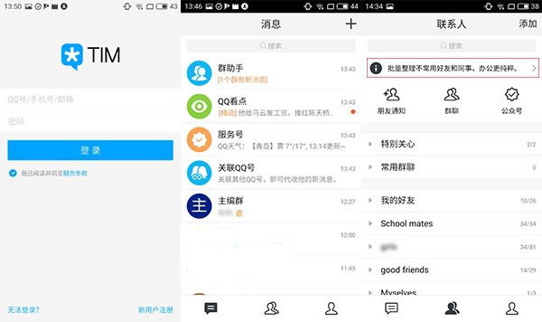 1、滤掉了大量QQ中的个性化内容和功能、界面干净简洁、操作上轻量易用、提供批量整理好友减少无效社交、邮件日程名片功能等都能看出TIM想营造一个纯粹的办公环境。