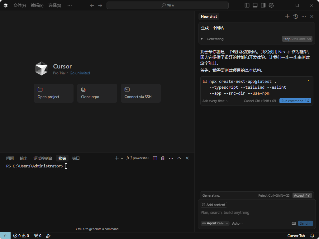 生成代码:在空白区域按下Ctrl+K,直接输入需求,例如“生成一个快速排序算法”、“创建一个React组件”,Cursor就能快速生成相应代码。