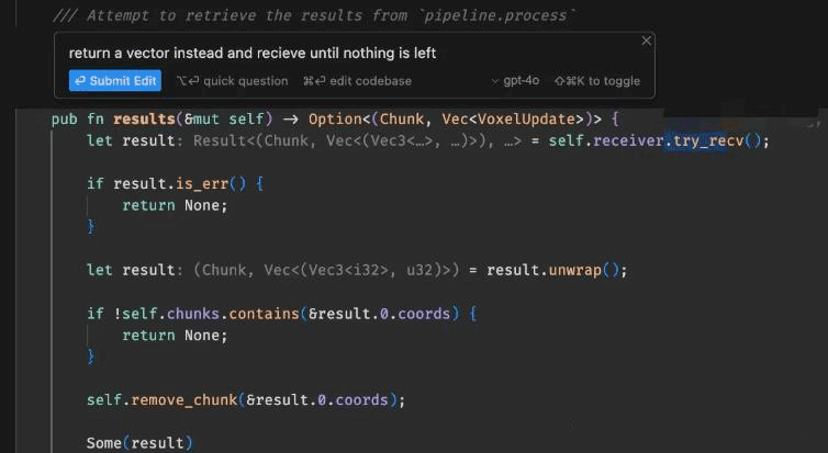 内联编辑:在代码编辑器中选择一段代码后,会出现一个编辑图标,点击该图标,并输入文字指令,就可以对代码进行修改。