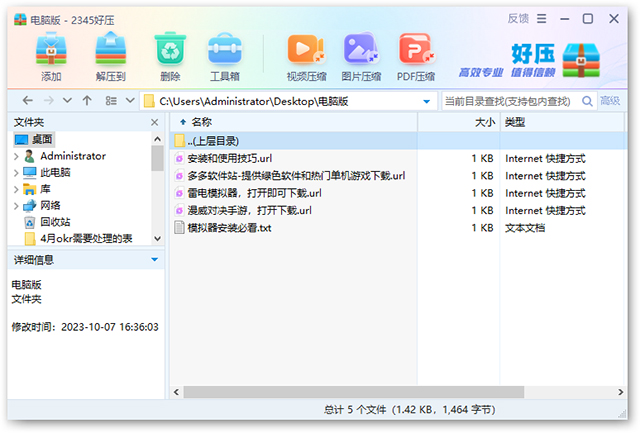 好压解压软件电脑版是一款是非常经典的解压缩软件,又叫做2345好压,英文名称HaoZip,能够兼容所有Windows系统、支持42种压缩格式,可以非常便捷的将文件进行压缩和解压,支持的文件类型广泛,解压速度快,打包以后可以有效的减小文件的大小,使用和传输都非常方便。同时相比其它压缩软件,2345好压电脑版占用更少的系统资源用,有更好的兼容性,压缩率比较高,并始至终都承诺永久免费使用,且完美支持Win10、Win8、Win7、Vista、WinXP和Win2003在内的所有Windows系统。