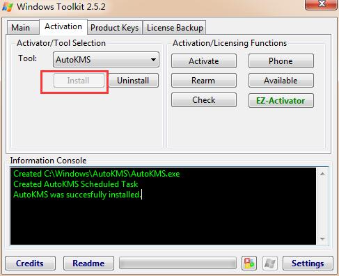 点击上图红框中的office图标,进入主界面后选择“Activation”菜单选项,先点左侧的“install”,显示AutoKMS安装成功。然后再点击右侧下面的“EZ-Activator”按钮。