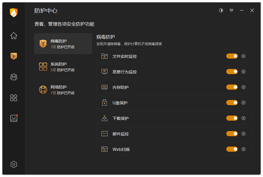 防护中心设置了多达14类防护开关,只需点击开关,即可方便、快捷的开启或关闭相应防护功能。当发现威胁动作触发已经开启的防护项目时,将精准拦截威胁,避免电脑受到侵害。