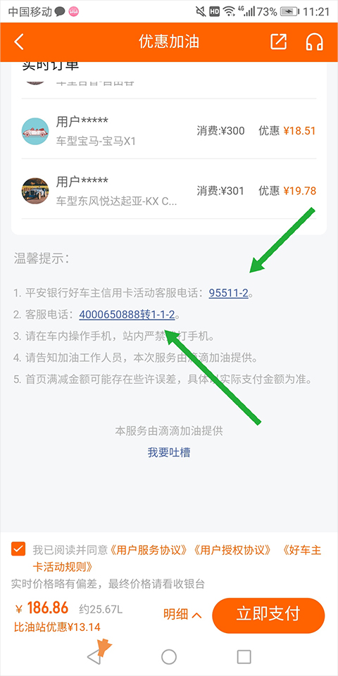 请务必先到达油站与工作人员确认后再付款,切勿先下单后去加油,油站日常流水较大,不在场订单有可能被退单,请避免因权益丢失或订单费用流失造成的不必要的损失。