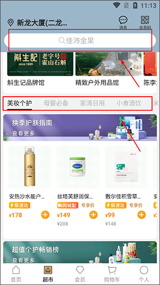 2、在【超市】页面,点击上方的【搜索】需要购买的商品,或是点击下方的分类查找;