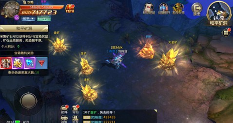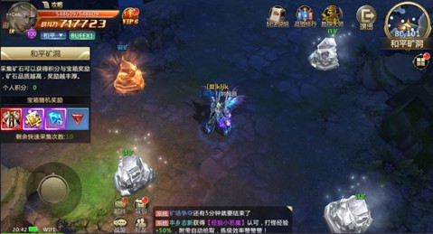 和平矿洞是混沌起源的特色玩法,每天24小时无时限进入,玩家可以在矿洞内采集矿场资源,获得宝藏碎片和极品装备,宝藏碎片可以合成寻宝钥匙,免费寻宝!和平矿洞为和平地图,不可PK!